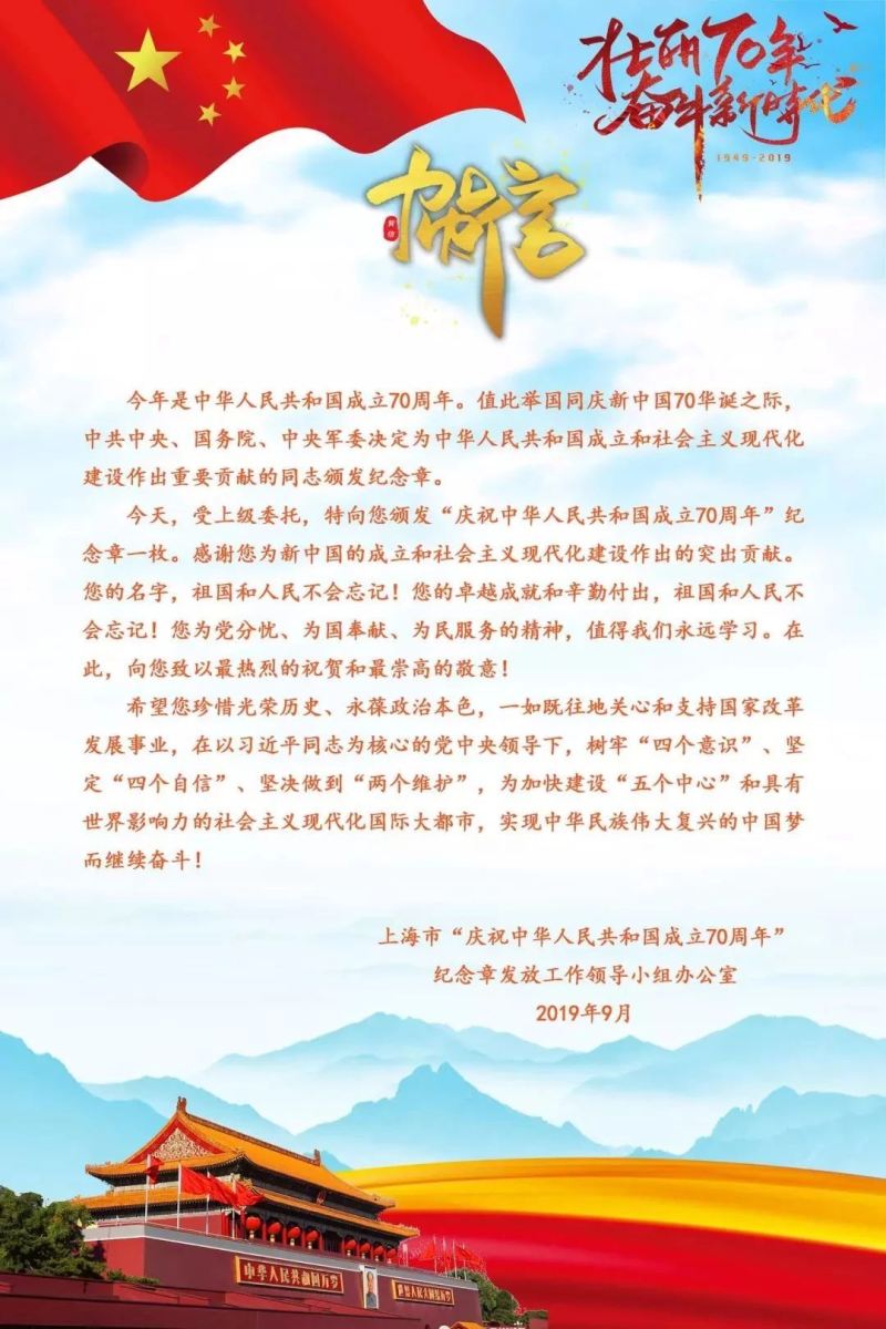 上海共有900余名全国劳动模范和先进工作者获此纪念章。上海市“庆祝中华人民共和国成立70周年”纪念章发放工作领导小组办公室向纪念章获得者发来贺信。